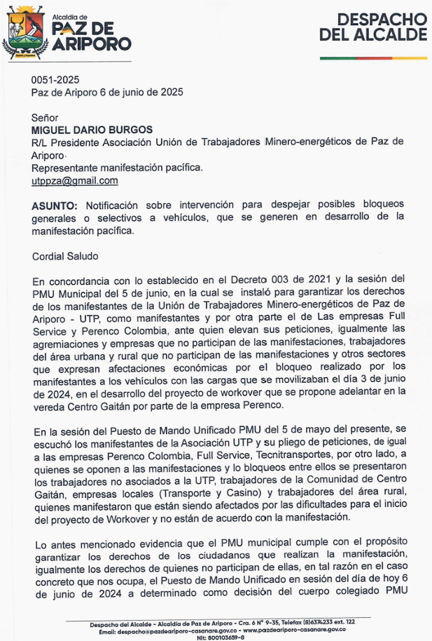 En una lacónica e insubstancial respuesta al pliego de peticiones de los trabajadores de la UTP, que no fueron siquiera reseñados, ni abordados los temas que atañen a la protesta, en la respuesta por escrito dirigida al líder social Miguel Burgos, quien es el representante legal de la Asociación Unión de Trabajadores Mineroenergéticos de Paz de Ariporo le expresan: