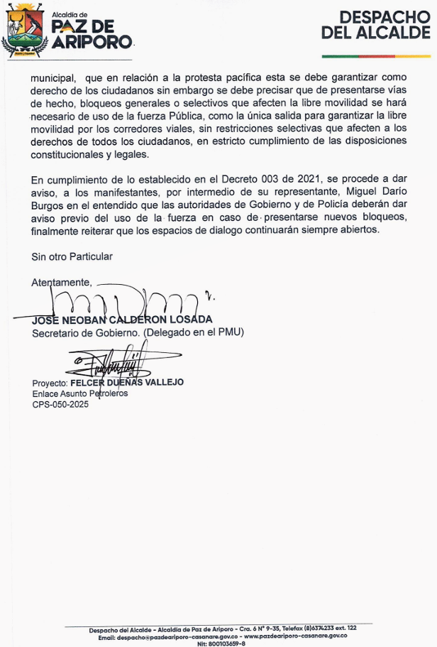 Ante éste comunicado por parte de la Administración Municipal de Paz de Ariporo aseguran los asociados voceros de los manifestantes de la UTP que “si la empresa Full Services y la operadora PERENCO apoyada por la alcaldía se va a saltar los conductos regulares del PMU, atacaremos el acto administrativos que lo asume como tal y lo haremos por las vías legales administrativas, así sea polarizando más el conflicto que ellos han creado pues nosotros no vamos dejar pasar esa maquinaria de éste lugar, hasta tanto no se llegue a un acuerdo y el PMU se tenga que terminar con todos los entes que están implicados y no solo lo que decida unilateralmente el alcalde, la empresa contratista y PERENCO y dejen a todos los entes por fuera”, “entonces nosotros de aquí ¡¡¡NO NOS VAMOS A MOVER”!!!… …Seguiremos Comunicando a #Casanare. …Red de Medios Alternativos de #Casanare.