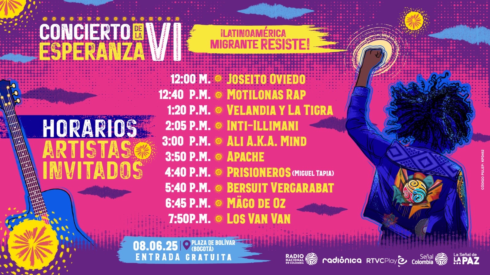 Los artistas internacionales del Concierto de la Esperanza ¡Latinoamérica Migrante Resiste!, estarán junto a importantes exponentes nacionales, en este escenario de ENTRADA LIBRE donde su talento musical llegará a miles de personas en vivo y en directo, con una producción de calidad global, con artistas como Joseito Oviedo, Velandia y La Tigra, Motilonas RAP y Ali A.K.A. Mind.