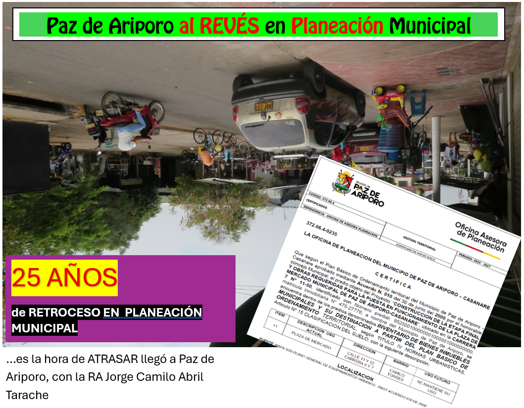 Las certificaciones de uso de suelo que la actual Alcaldía de Paz de Ariporo expide están basadas en el arcaico Plan Básico de Ordenamiento Territorial “acuerdo número 010 del 30 de junio del año 2000” es decir hace 25 años el Ingeniero Oscar Gutemberg Benítez en el Marco de su programa de gobierno “La Union Hace la Paz” con su equipo de profesionales construyeron el Plan Básico de Ordenamiento Territorial “Paz de Ariporo el Gran Emporio Agroindustrial, Ganadero y de Desarrollo Social de la Orinoquia” donde se determina la división político administrativa, los usos del suelo para las diferentes zonas de los sectores urbano, rural e indígena, se establecen las reglamentaciones urbanísticas y de manejo correspondientes, donde además se plantean los planes complementarios para el futuro desarrollo territorial del municipio.