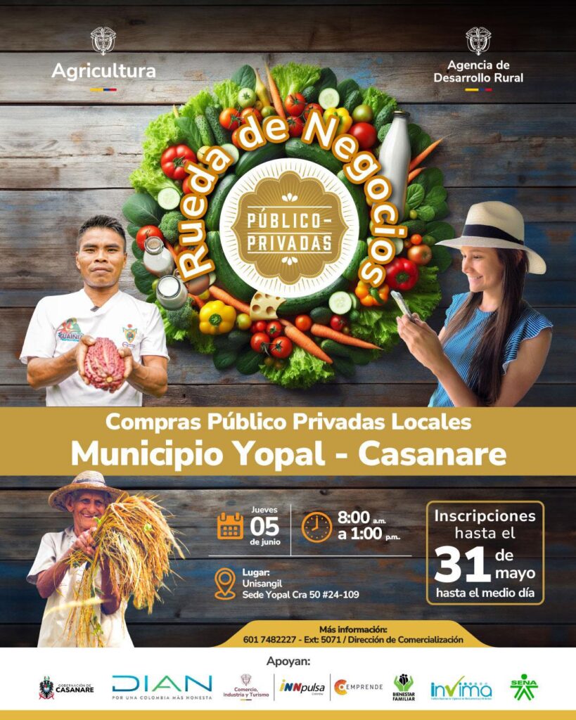 La Agencia de Desarrollo Rural te invita a participar en la próxima Rueda de Negocios, un espacio diseñado para fortalecer los lazos comerciales entre la Agricultura Campesina, Familiar y Comunitaria (ACFC) del Casanare, las entidades del Estado y los programas gubernamentales.